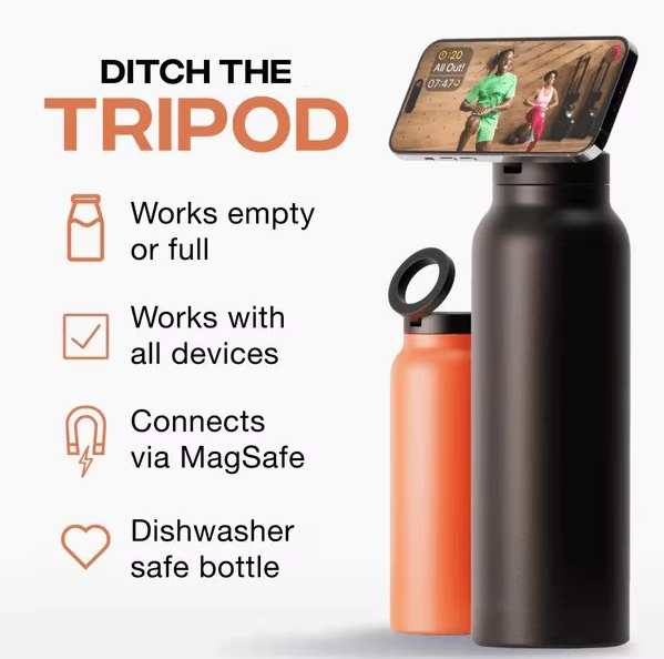 The NexMag Bottle combines a stainless-steel insulated water bottle with a powerful magnetic mount, letting you attach your phone securely for hands-free filming, workouts, or video calls — no tripod needed.